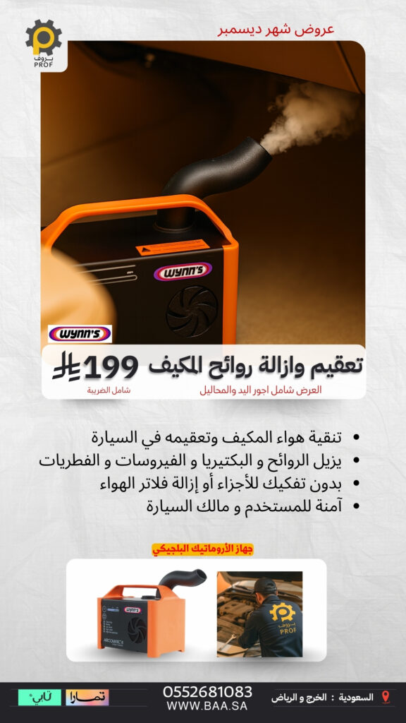 خدمة تعقيم وإزالة روائح المكيف في مراكز بروف تضمن هواء أنظف داخل السيارة من خلال تنقية وتعقيم نظام التكييف بالكامل باستخدام أجهزة متخصصة، بدون فك أو إزالة أي أجزاء. الخدمة تقضي على الروائح الكريهة والبكتيريا والفطريات، وتحافظ على بيئة صحية وآمنة داخل السيارة، بسعر 199 ريال شامل الضريبة وأجور اليد، ومتوفرة في جميع فروع بروف بالرياض والخرج.
